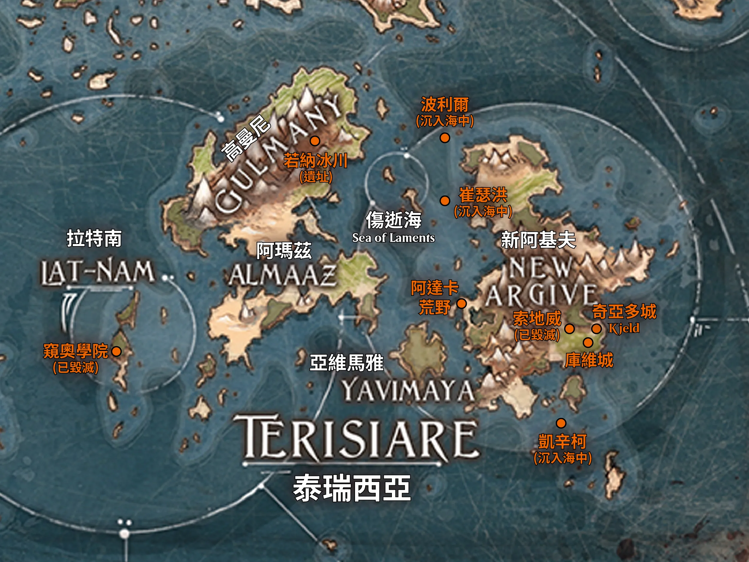 須注意的是,大解凍初期,泰瑞西亞的冰雪尚未完全融化,土地面積較大;上圖描繪的是大解凍 1600 多年後的世界樣貌,冰雪已消融殆盡,故水域面積大幅增加,許多地勢較低之處已沒入海中,例如崔瑟洪要塞 (Keep of Tresserhorn) 和波利爾等。