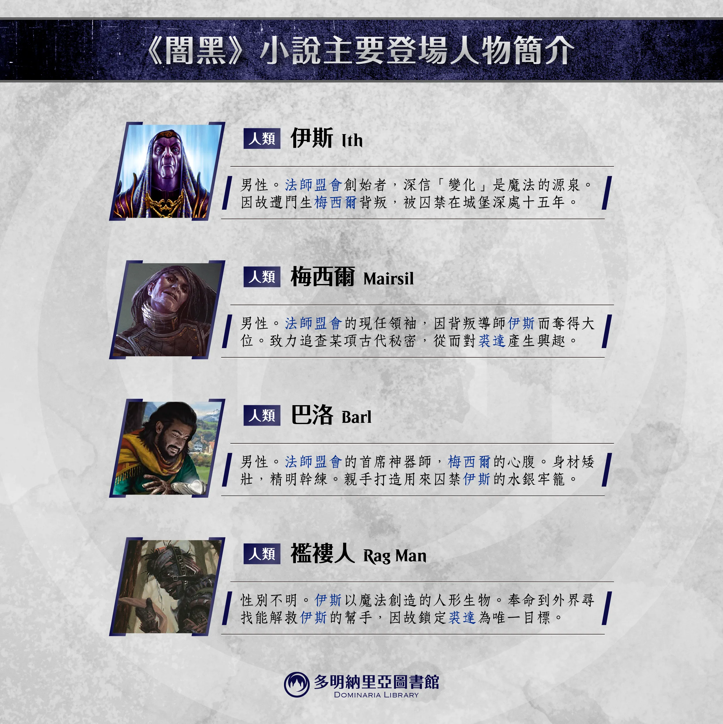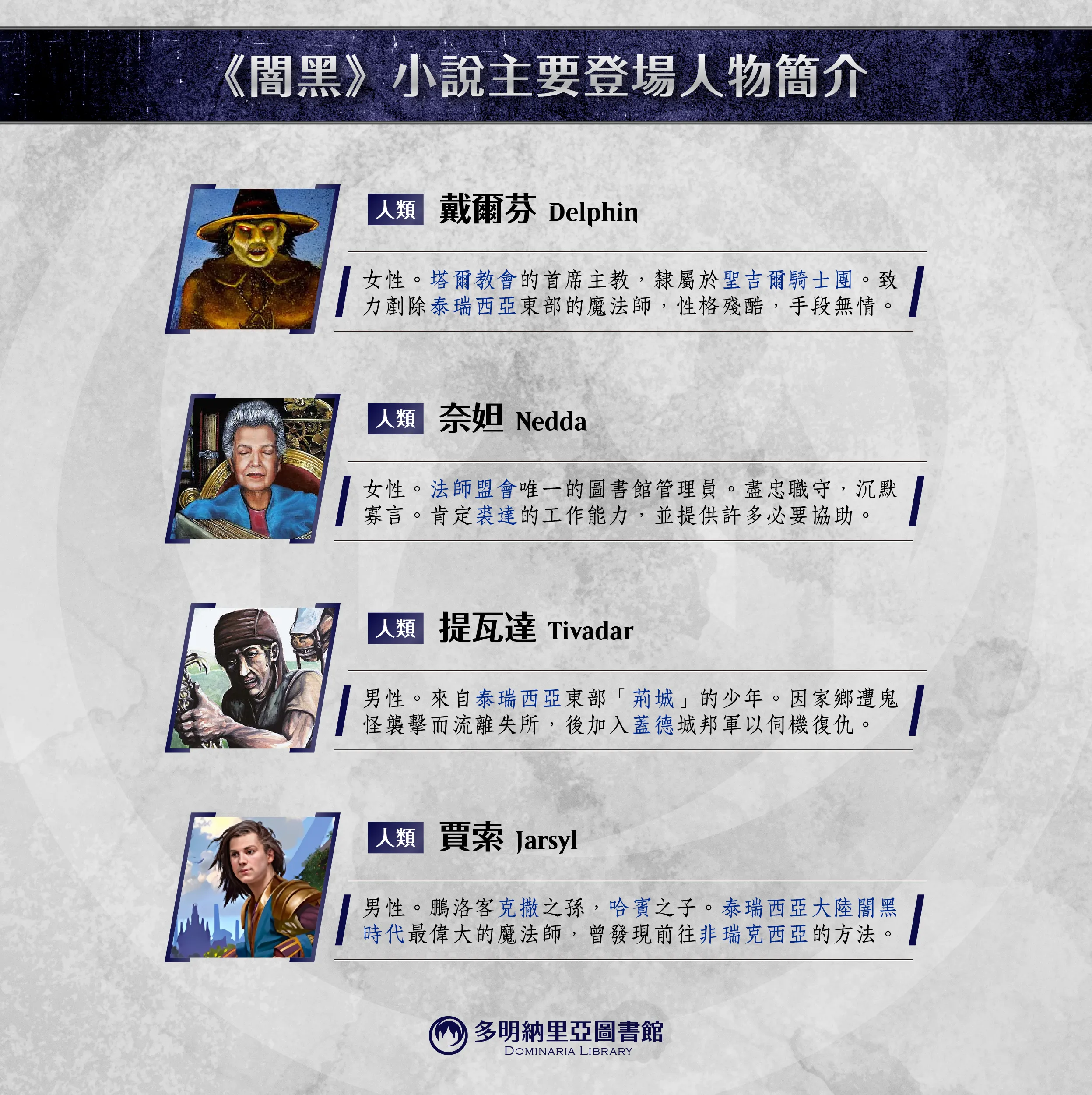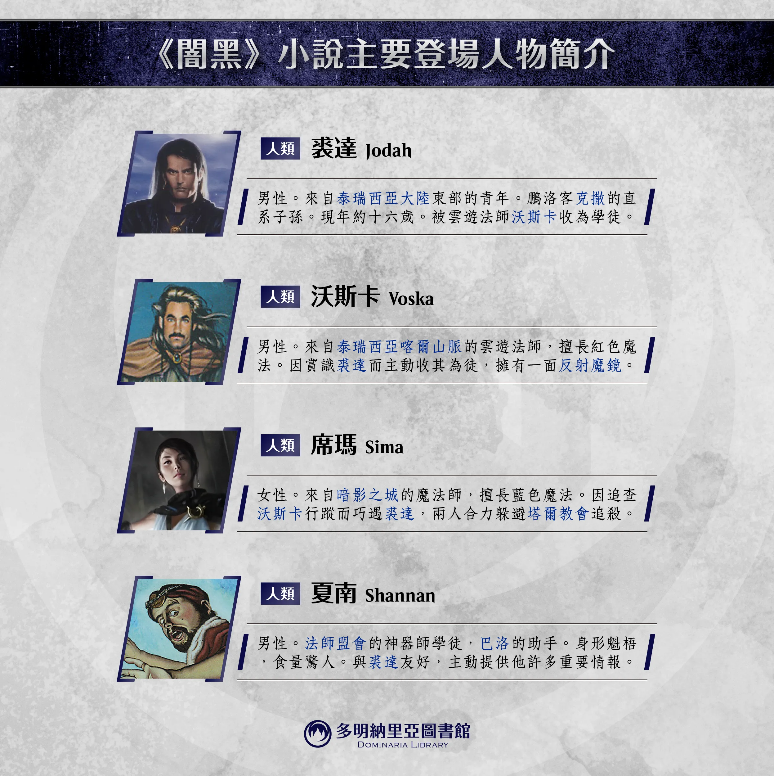 以下列出於小說《漸臨闇黑》中登場的主要人物(點擊圖片可放大):